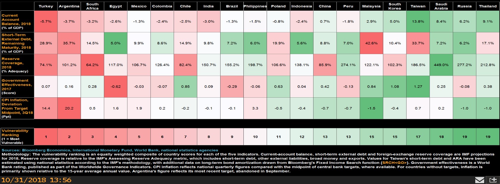 Para dejarles algo más de conocimiento en estas líneas, ayer otro lector me mandó una interesante tabla de vulnerabilidades. A quien desee se la puedo enviar: básicamente, de acuerdo a ciertos parámetros, los países emergentes más vulnerables en este momento son Turquía, Argentina y Sudáfrica.
