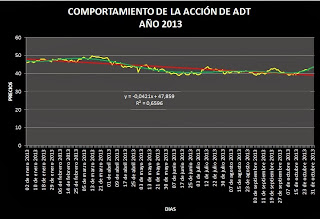 El comportamiento de la acción de ADT, partiendo el 2 de enero del año 2013 al día 3 de Noviembre presenta el comportamiento que se muestra en la siguiente gráfico: