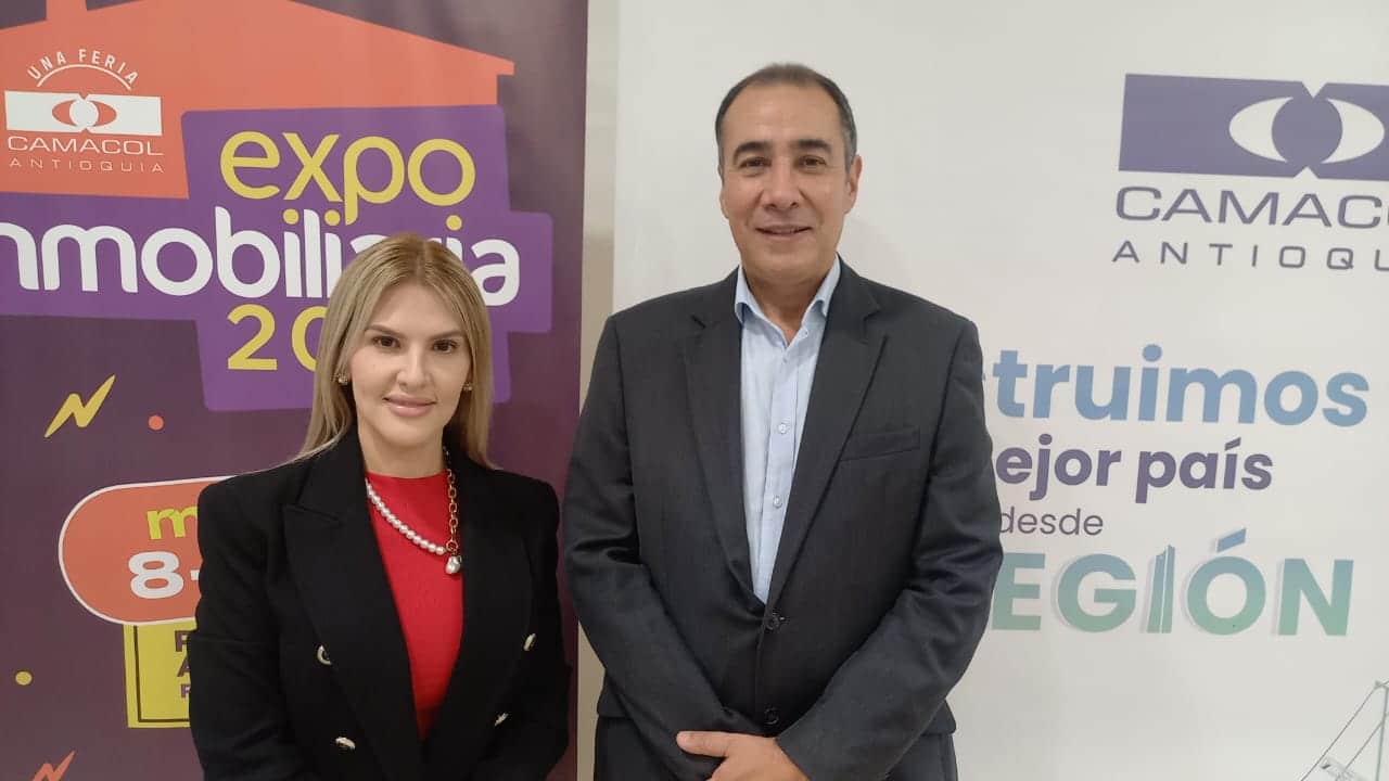 Tatiana Castaño Agudelo, directora de Ferias; y Eduardo Loaiza, gerente regional de Camacol Antioquia, en la presentación de Expoinmobiliaria, en San Fernando Plaza, Medellín. Foto cortesía.