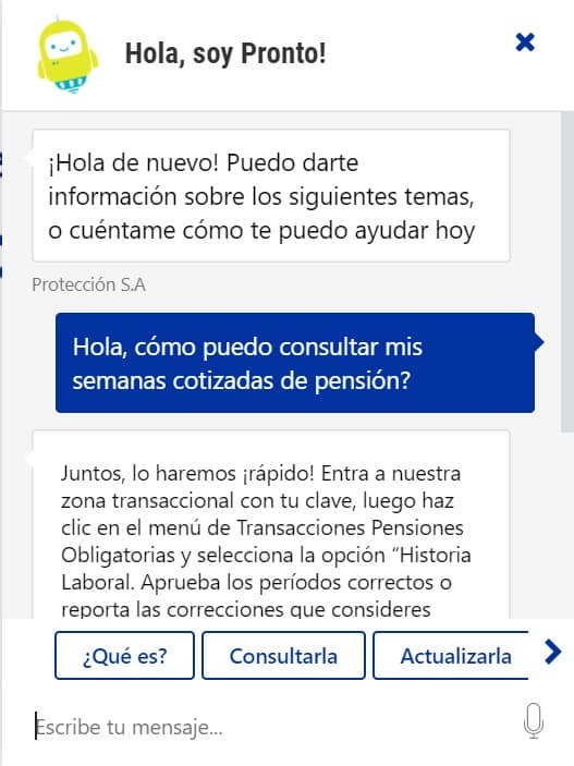 Por esa razón, la compañía lanzó el asistente virtual ‘Pronto’, con el cual ha podido proporcionar respuestas automatizadas, las 24 horas y los 7 días de la semana, a las preguntas de los usuarios relacionadas con temas recurrentes como saldos y certificaciones de pensiones.